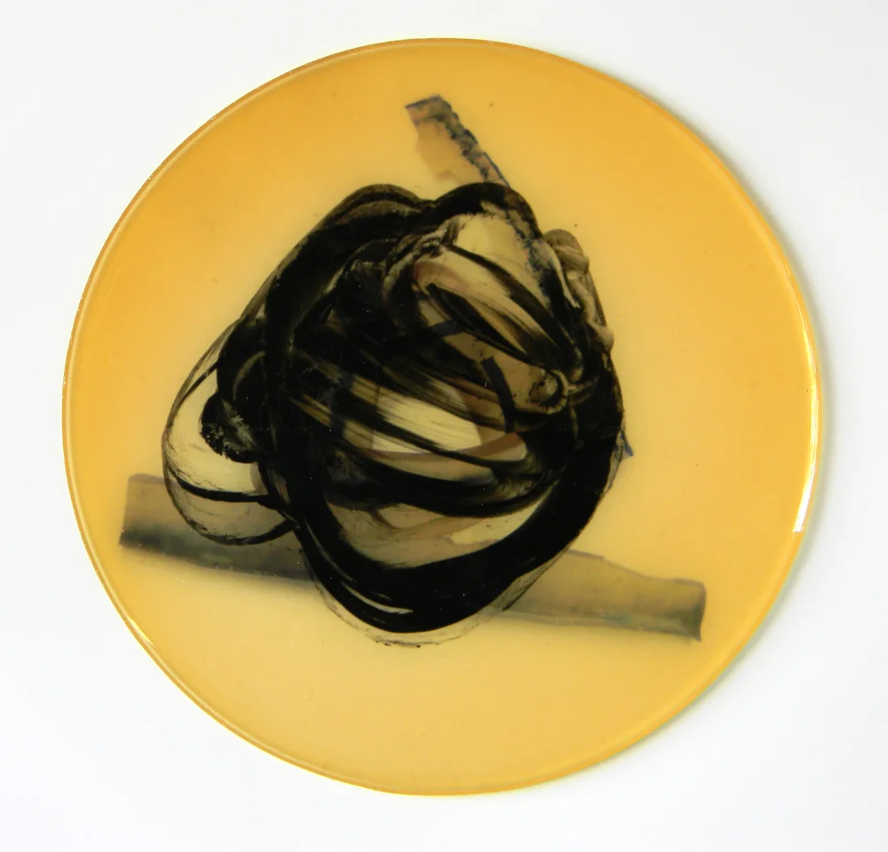 Comprised of more than 45 images this series begins with a set of inked and cast urethane strips. These are often tied or knotted and then photographed. The photographs, digitally printed, have an overlay of a cast urethane disk and monotype.